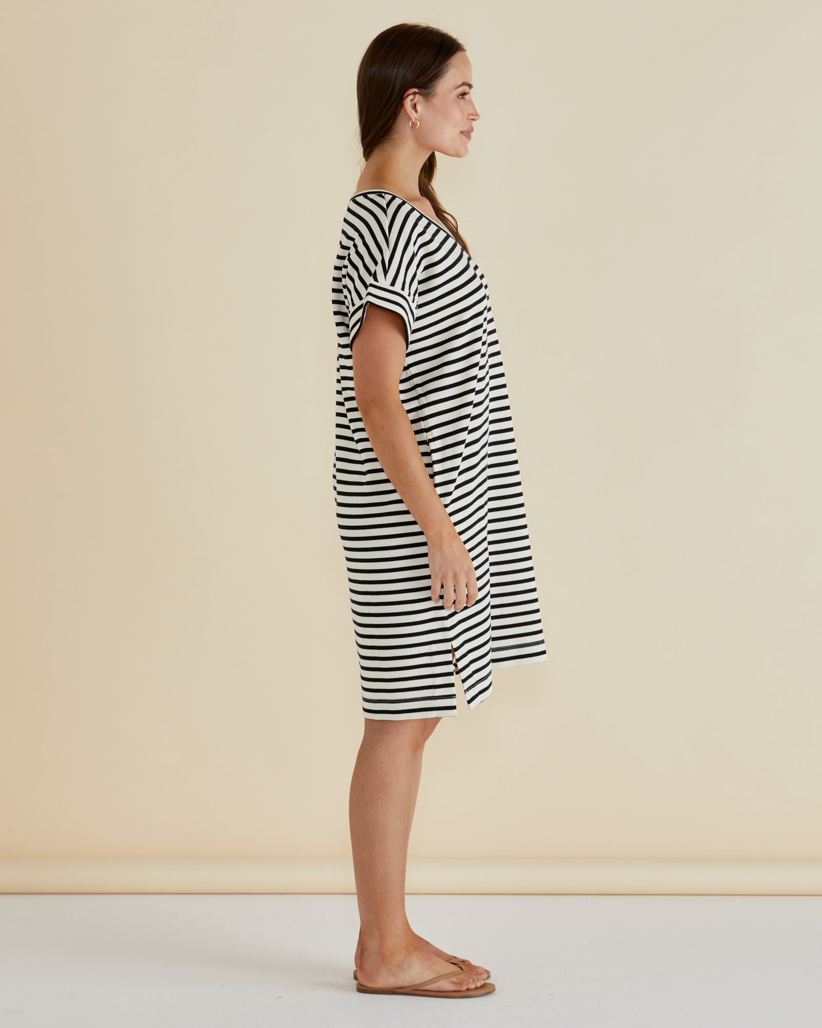 Betty Basics Elise V-Neck Rib Dress | Black White Stripe