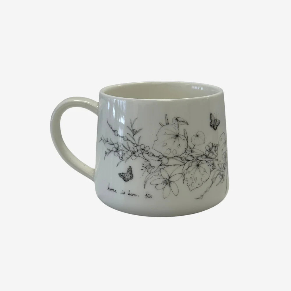 ‘Home is here’, featuring a tūī bird perched on a wave of Aotearoa | New Zealand native flora, including- puawananga | clematis, kawakawa, mānuka and kōwhai.