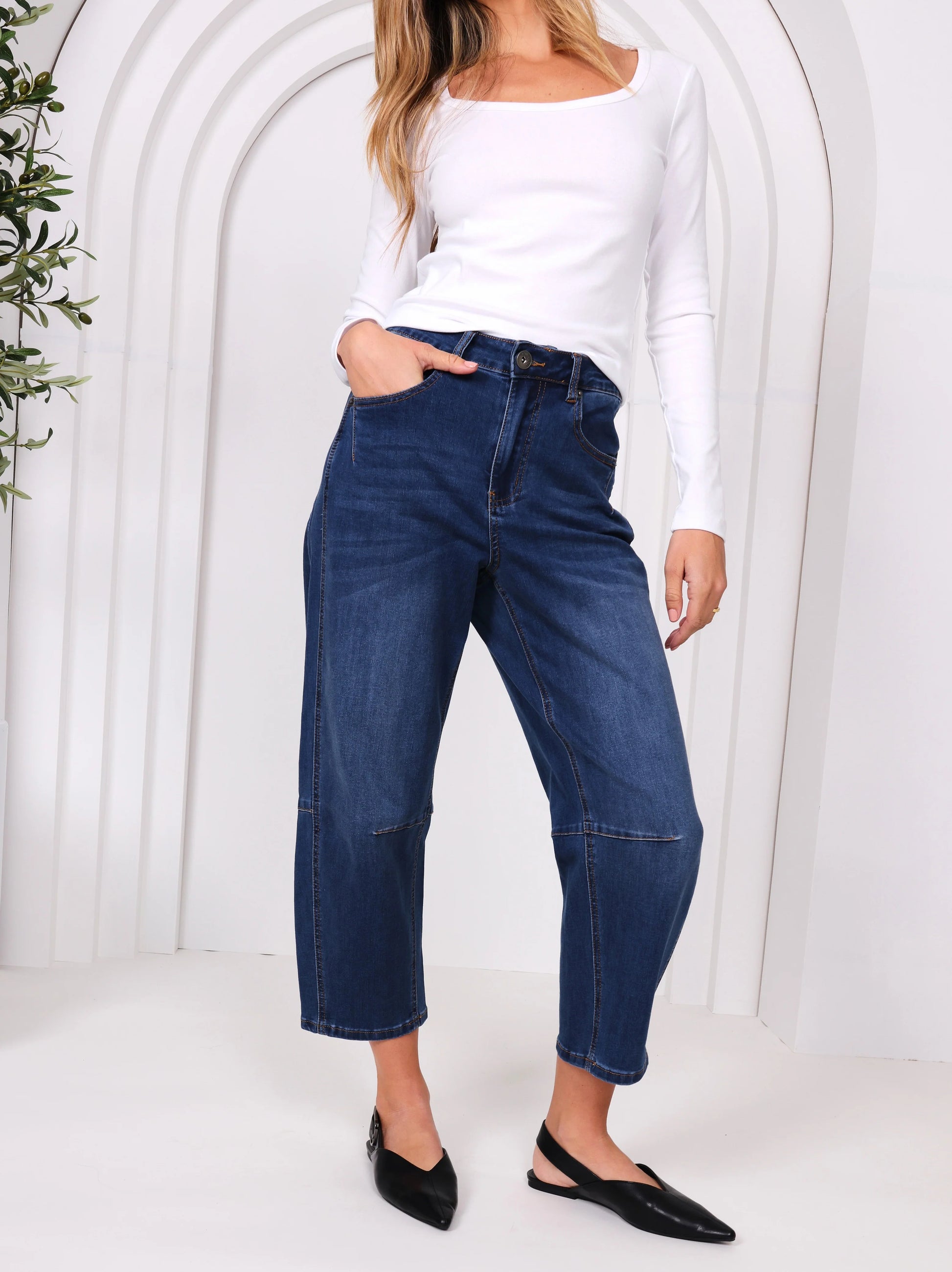 Characteristics of Toni Barrel-Leg Jeans include a fitted waist, flared-out shape around the mid-leg, and tapered silhouette at the bottom, which exudes the look of, well, a barrel. It's the vibe of a cowboy ready for a showdown in the Wild, Wild West!!!