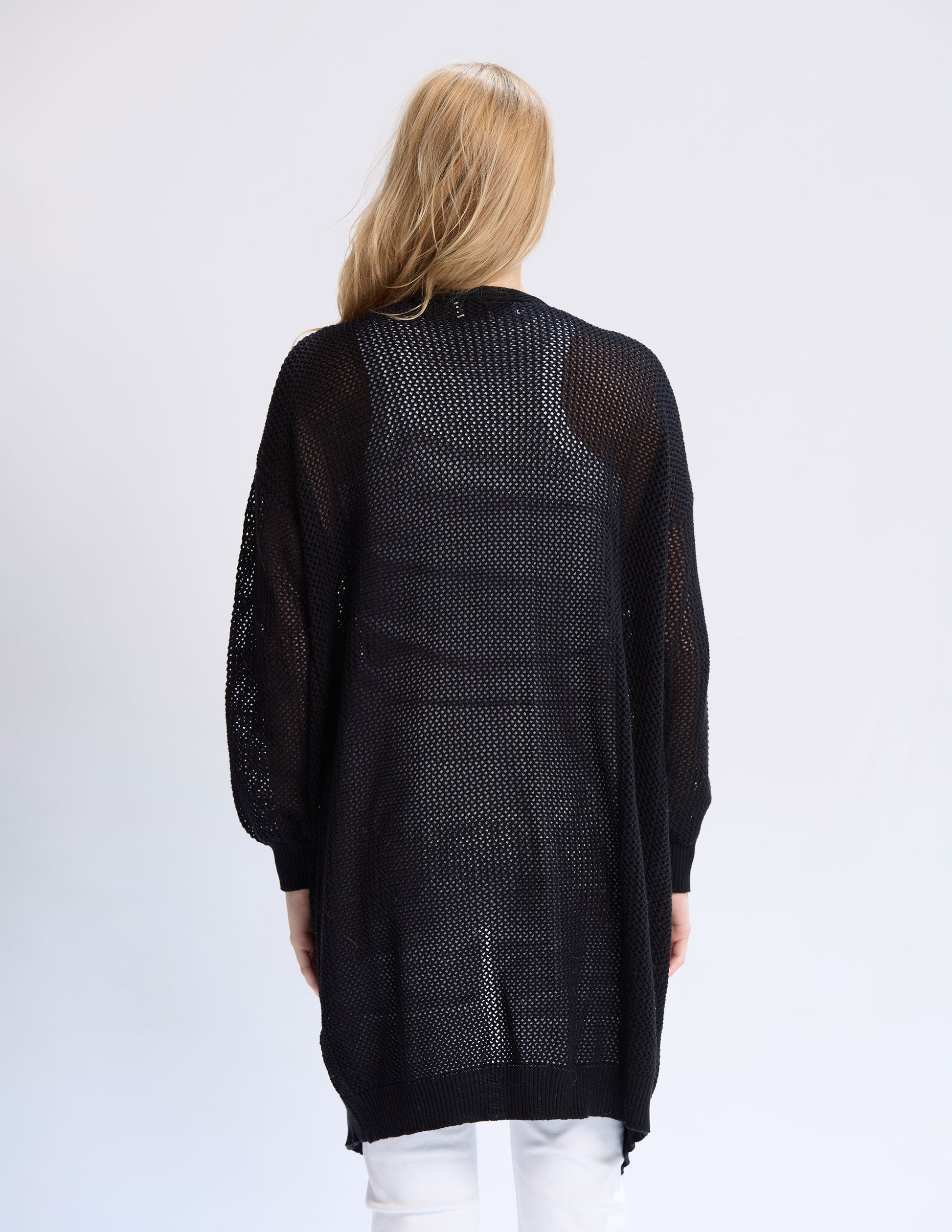 Open waffle knit knee length cardigan with ribbed trims
