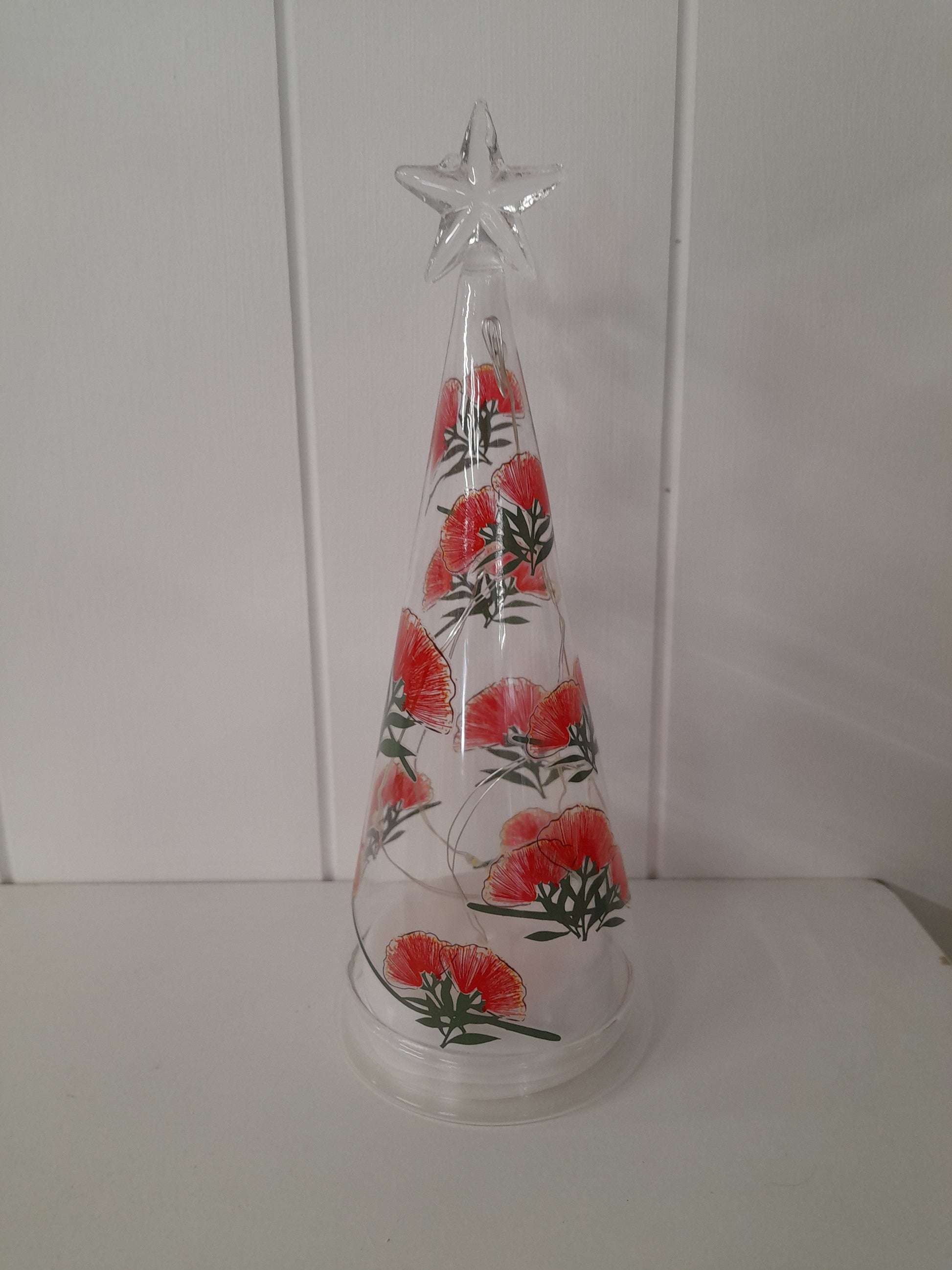 Clear glass cone Pōhutukawa tree featuring a star on top and subtle internal lights.
