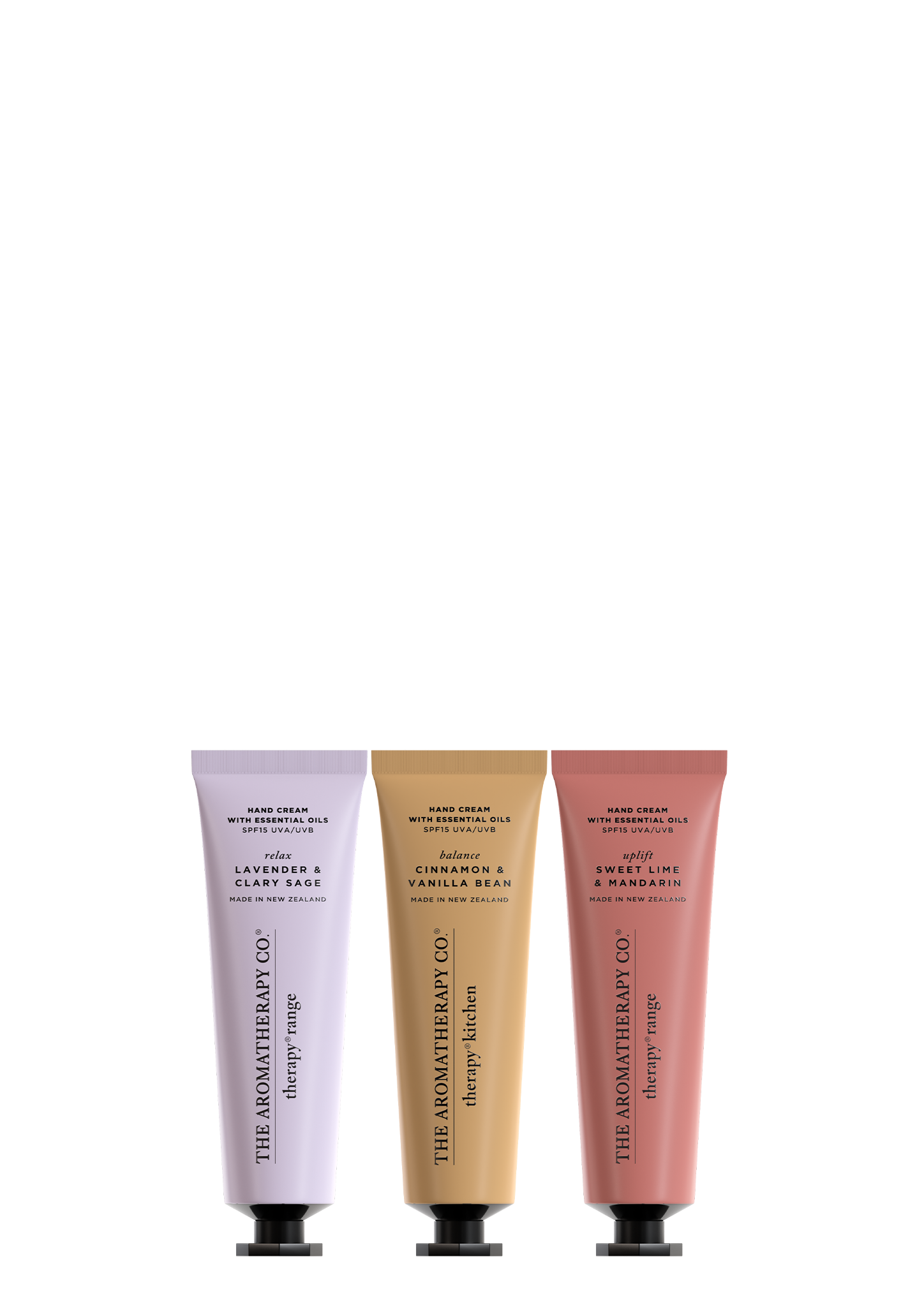 Pamper your hands with our Limited Edition Therapy hand cream trio gift set, featuring three luxurious blends designed to Relax, Balance and Uplift. Infused with the enriching properties of Avocado, Kawakawa, and Coconut oils to deeply hydrate and nourish your skin and SPF15 to also provide essential protection against sun damage. Made in New Zealand, this exclusive set is perfect for gifting or indulging in a little self-care.
